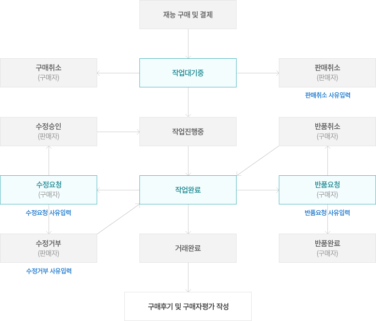 - 작업대기중, 작업진행증, 거래완료 상태에서는 수정요청이 불가하며, 기타 수정요청은 대화하기를 통해 가능합니다.